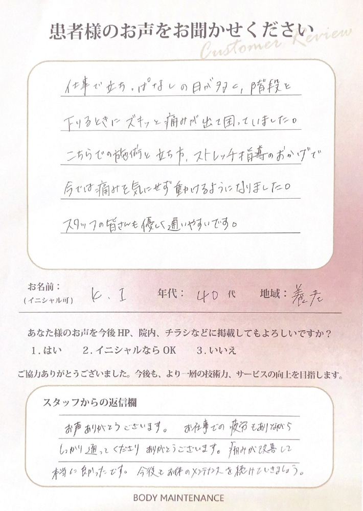 お声ありがとうございます。お仕事での疲労もありながらしっかり通ってくださりありがとうございます。痛みが改善して本当に良かったです。今後もお体のメンテナンスを続けていきましょう。