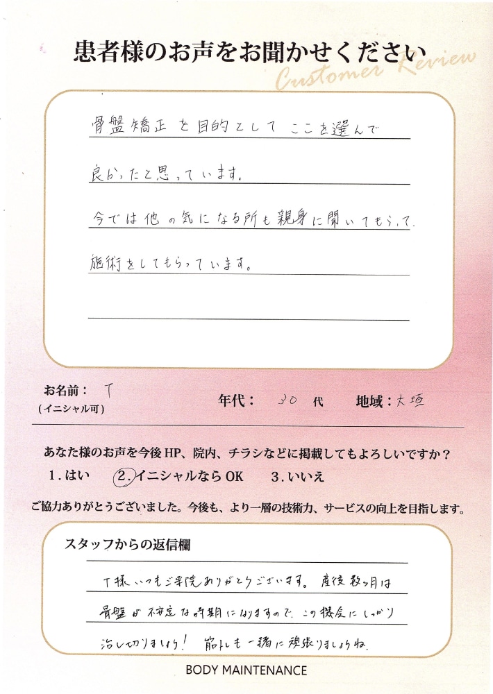 T様、いつもご来院ありがとうございます。産後、数カ月は骨盤が不安定な時期になりますので、この機会にしっかり治し切りましょう!筋トレも一緒に頑張りましょうね。