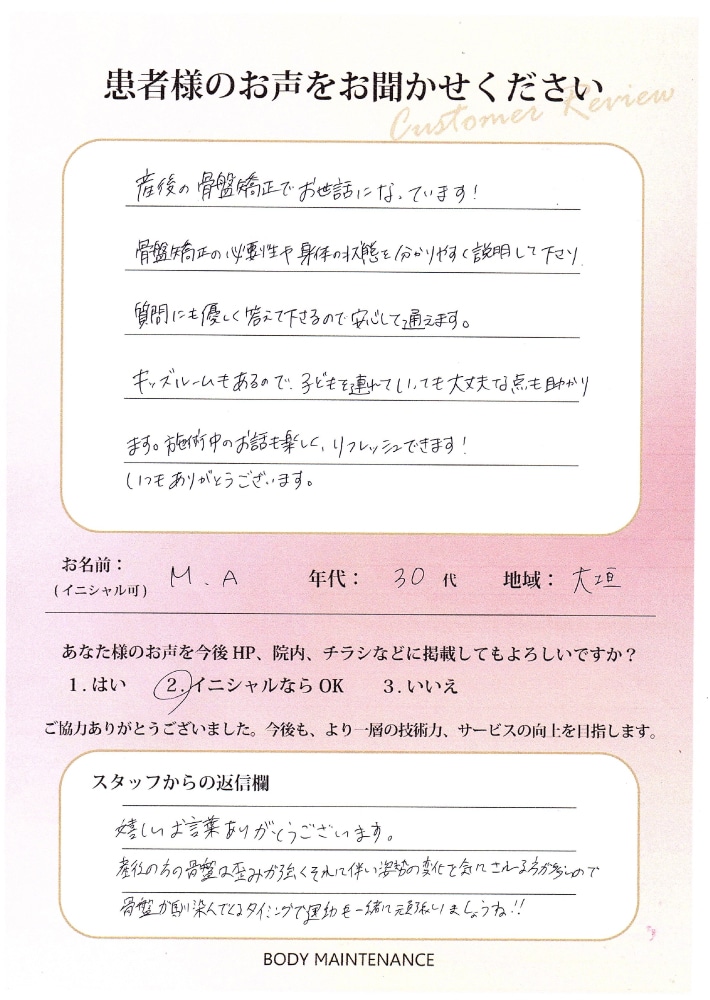 当院をご利用いただきありがとうございます。産後の方の骨盤はすごく歪んでしまい、それに伴い姿勢の変化を気にされる方も多いので治療と運動共に頑張っていきましょう!今後もよろしくお願いします!