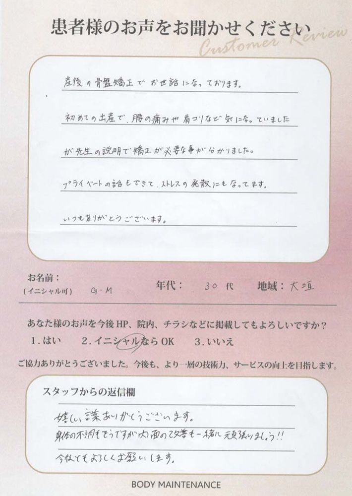 産後の骨盤矯正で通っています。ちょっと興味があるな~程度で何も分からないまま来院したのですが、骨盤矯正のことや身体の状態を分かりやすく説明してくださり安心でした!施術も丁寧で毎回、身体が軽くなったり姿勢が良くなったりを実感しています。いつもありがとうございます。今後もよろしくお願いします!スタッフよりご返信欄