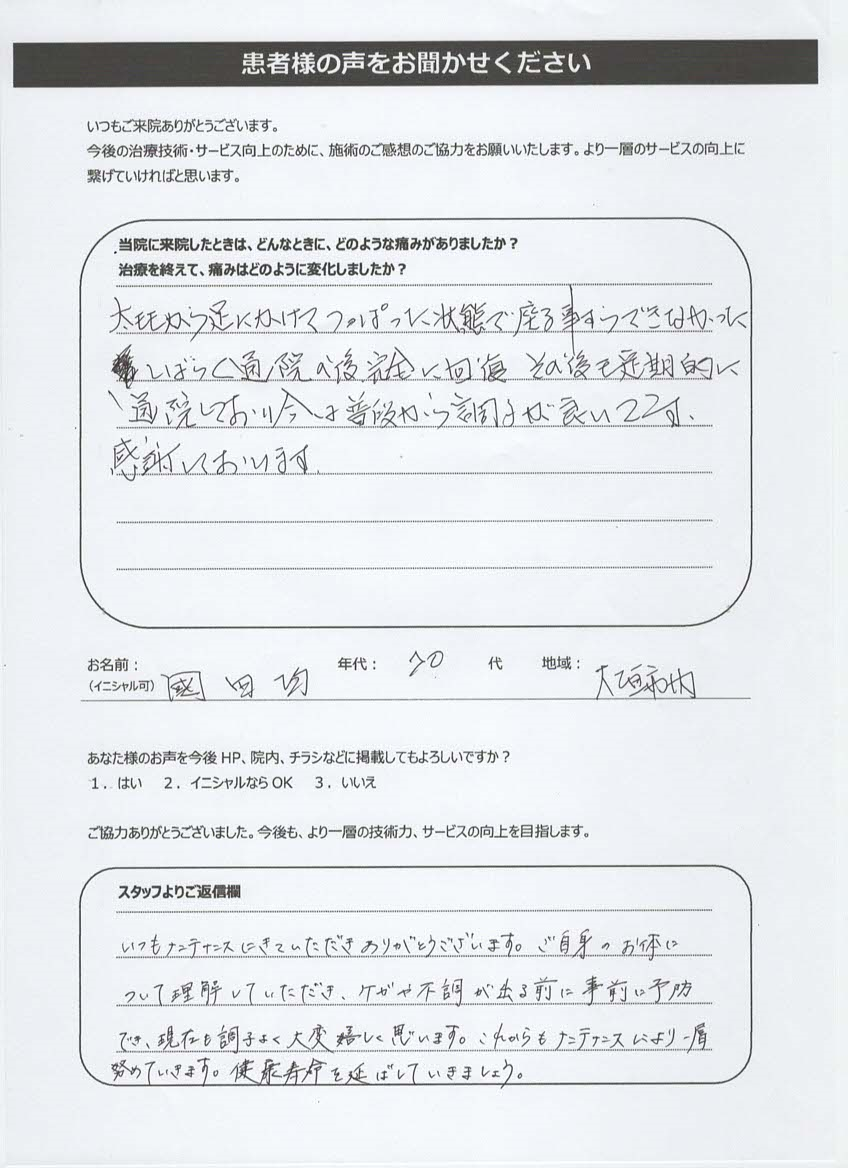 いつもメンテナンスにきていただきありがとうございます。ご自身のお体について理解していただき、ケガや不調が出る前に事前に予防でき、現在も調子良く大変嬉しく思います。これからもメンテナンスにより一層努めていきます。健康寿命を伸ばしていきましょう。
