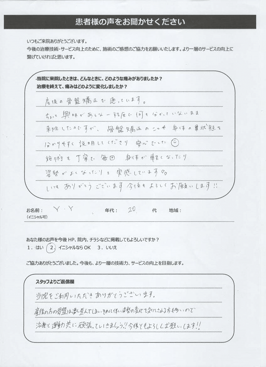 産後の骨盤矯正で通っています。ちょっと興味があるな~程度で何も分からないまま来院したのですが、骨盤矯正のことや身体の状態を分かりやすく説明してくださり安心でした!施術も丁寧で毎回、身体が軽くなったり姿勢が良くなったりを実感しています。いつもありがとうございます。今後もよろしくお願いします!スタッフよりご返信欄