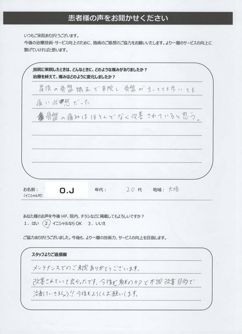 産後の骨盤矯正で来院し、骨盤が立ってても歩いても痛い状態だった。骨盤の痛みはほとんどなく改善されていると思う。スタッフよりご返信欄