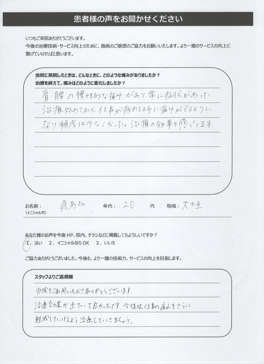 当院をご利用いただきありがとうございます。治療効果が出ていて良かったです。今後は仕事の疲れをさらに軽減していけるよう治療していきましょう。