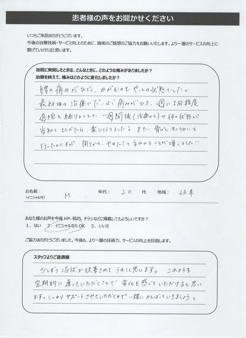 少しずつ症状が改善されてうれしく思います。こらからも定期的に通っていただくことで変化を感じていただけると思います。そっかりサポートさせていただくので一緒にがんばっていきましょう。