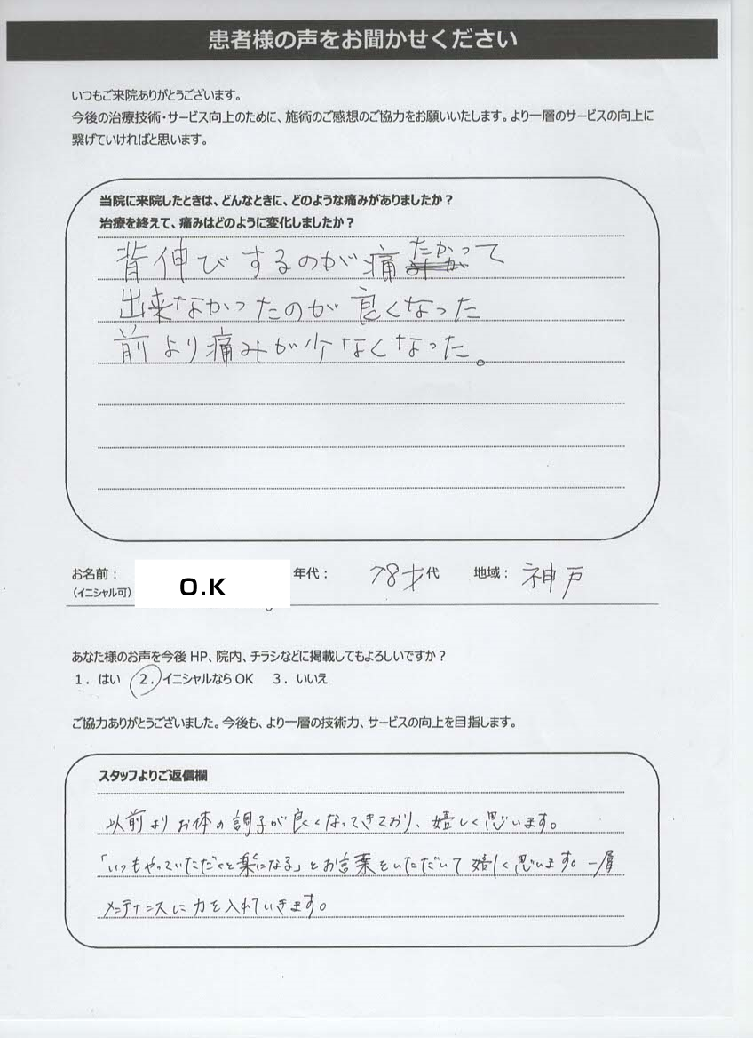 以前より、お体の調子が良くなってきており嬉しく思います。「いつもやっていただくと楽になる」とお言葉をいただいて嬉しく思います。一層メンテナンスに力を入れていきます。